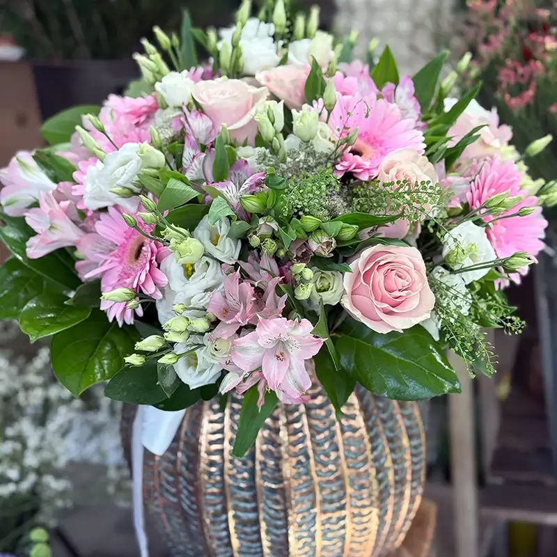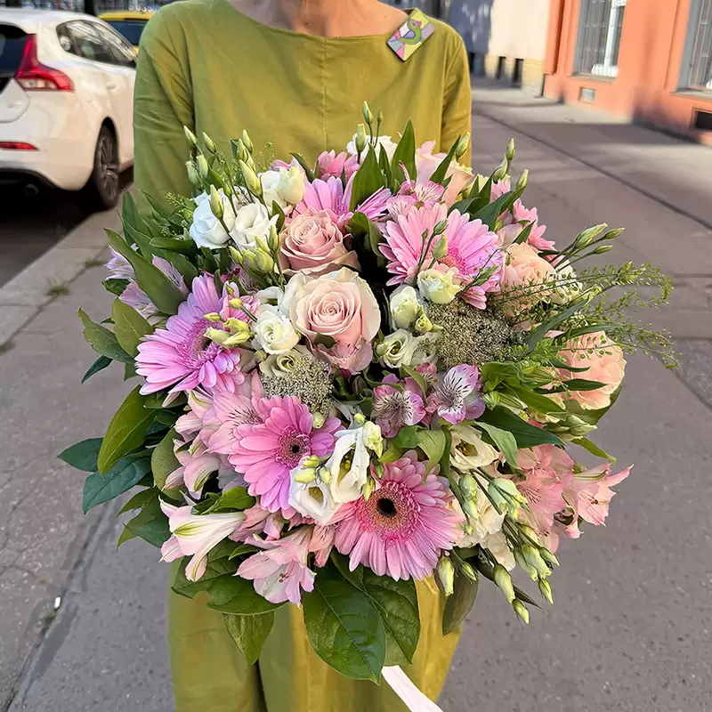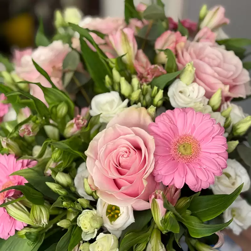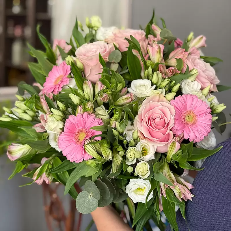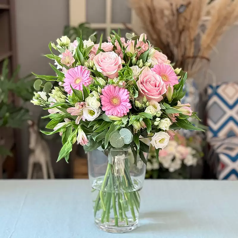 Řekněte jí, jak jste šťastni, že ji máte ve svém životě. Romantické aranžmá z gerber, růží, alstromérií, eustomy a zeleně vyjádří vaše city za vás.